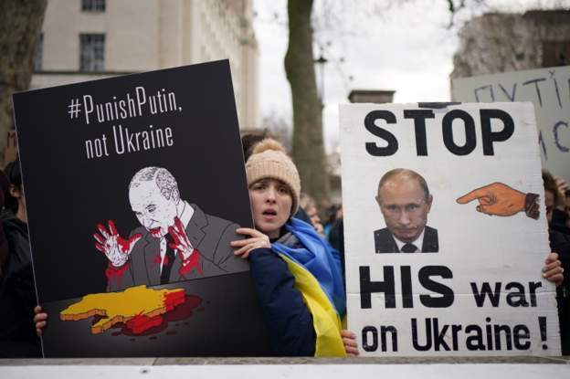 Некоторые несут плакаты с изображением Владимира Путина рядом со словами "террорист" и "убийца".
