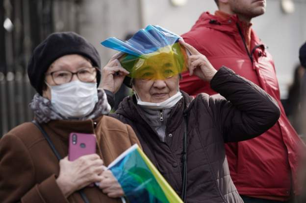Толпа замолчала, пока звучал государственный гимн Украины, прежде чем разразиться аплодисментами и возобновить скандирование "Остановите Путина. Остановите войну".
