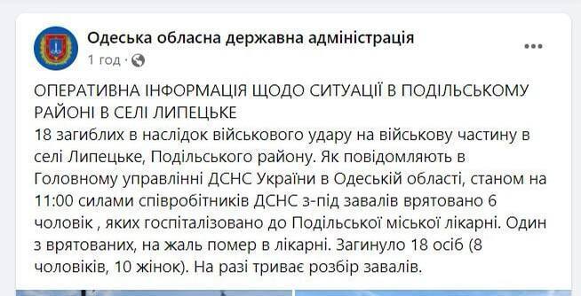 ⚡️ 18 человек погибло вследствие военного удара на воинскую часть в Липецком, Подольского района Одесской области. Из них 8 мужчин и 10 женщин.