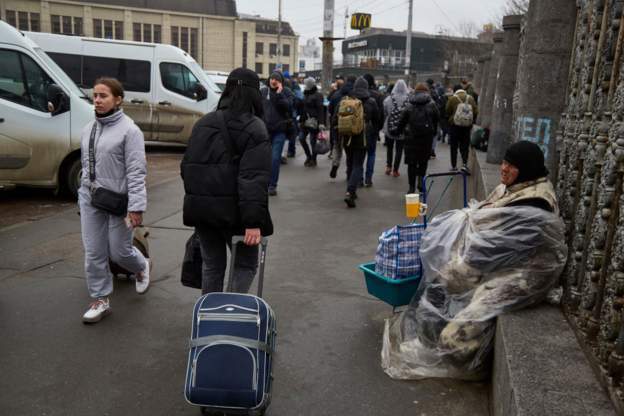 Бездомный сидит у железнодорожного вокзала, когда люди пытаются эвакуироваться из Киева