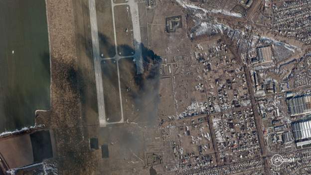 BBC поделилась снимком со спутника, на котором видно нападение на авиабазу Чугуев под Харьковом.