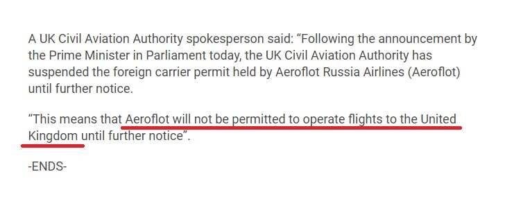 Британский авиарегулятор сообщил, что приостановил действие его разрешения на полеты в страну и из нее