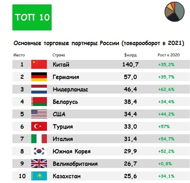 А вот с Беларусь (№4) и Казахстан (№10) в этих условиях станут более важными торговыми партнёрами. Китай же будет и дальше наращивать своё присутствие в нашей экономике.