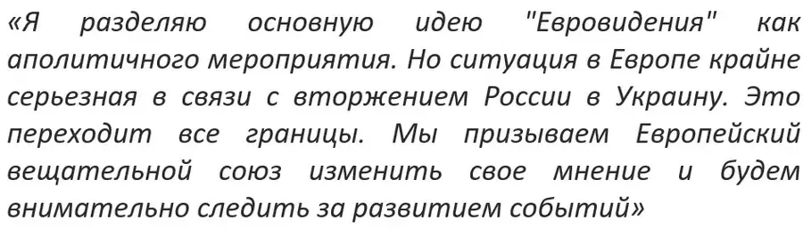 Также известно, что среди представителей других стран в социальных сетях был запущен хэштег #EurovisionwithoutRussia.