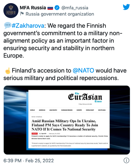 "Мы рассматриваем приверженность правительства Финляндии политике военного неприсоединения как важный фактор обеспечения безопасности и стабильности в Северной Европе", - сказала Захарова.