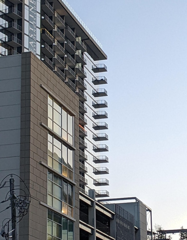 Стекла окон этого здания растянулись на всю стену и создали эффект зеркала. Из-за этого такое впечатление, будто балконы парят в воздухе... Забавно...