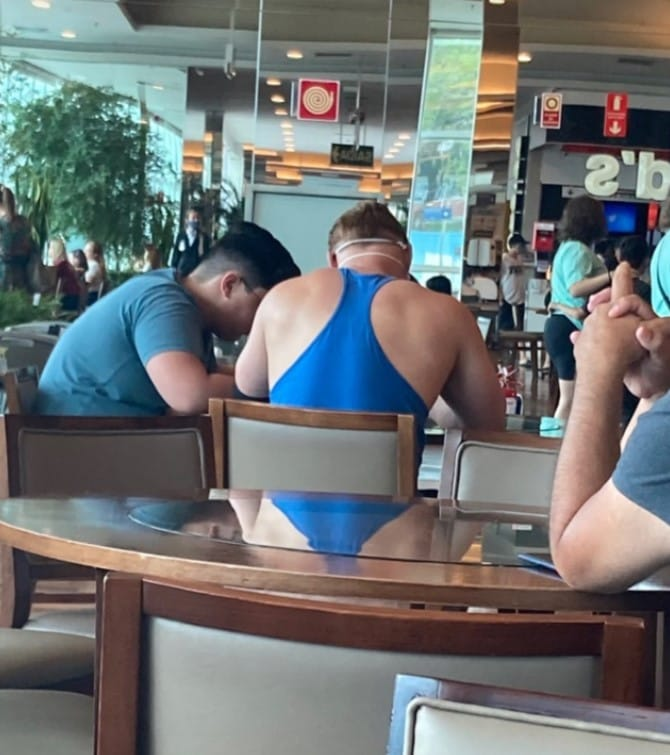 Если не всматриваться в фотографию, кажется, что мужчина сидит за столом в синем купальнике, но приглядевшись, мы видим, что это лишь отражение в соседнем столе.