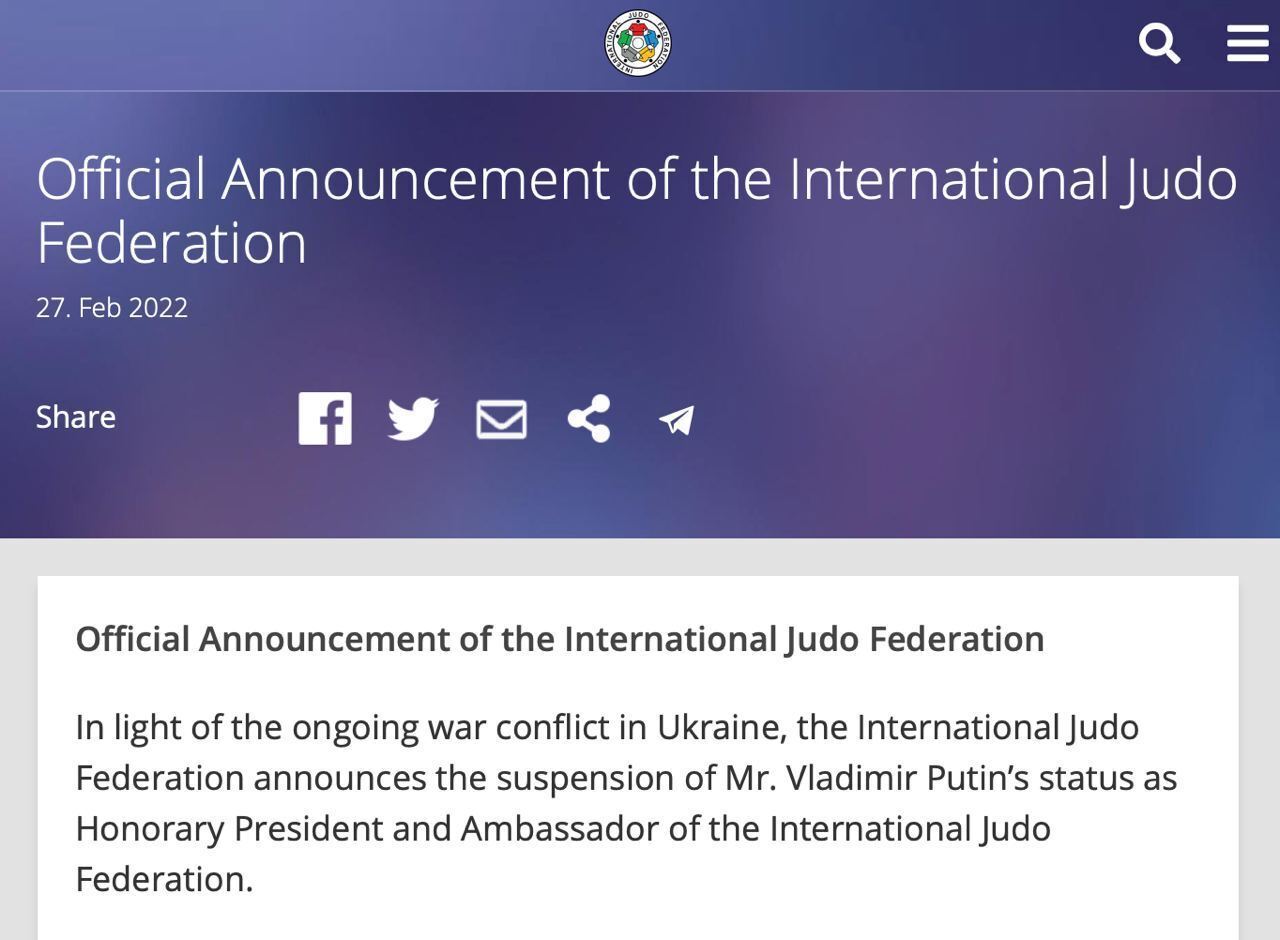Международная федерация дзюдо приостановила полномочия Владимира Путина в качестве почётного президента и посла организации.