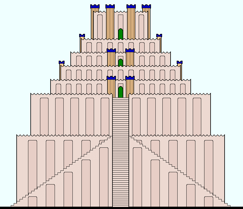 Сама же башня разрушалась и реконструировалась несколько раз. Только после последней и самой крупной реконструкции фундамент башни достиг ширины 90 м при такой же высоте сооружения. Подсчёты позволяют говорить о том, что для возведения этой башни было использовано около 85 млн кирпичей. Монументальная лестница вела к верхней платформе башни, где устремлялся в небо двухэтажный храм. Башня была частью храмового комплекса, располагавшегося на берегах реки Евфрат. Найденные археологами глиняные таблички с надписями позволяют утверждать, что каждая секция башни имела своё особое значение; те же таблички дают информацию о религиозных ритуалах, отправлявшихся в данном храме.