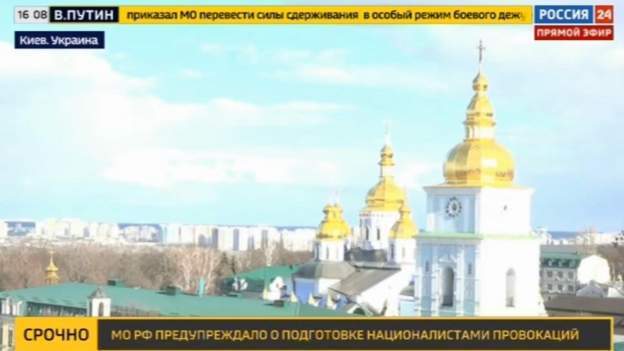 Прошло четыре дня после вторжения России, и управляемое Кремлем телевидение предоставляет зрителям параллельную реальность - придерживается линии, согласно которой силы повстанцев с востока продвигаются в Украину при поддержке российских войск, наносящих "точные удары" по украинской военной инфраструктуре.
