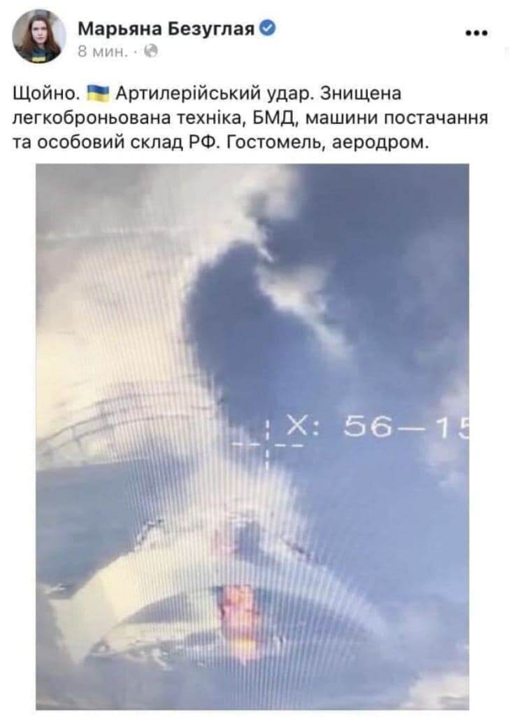 Правда: «Мрия» сгорела во время битвы за аэропорт Гостомель. Однако, сожгли самой большой в мире самолет силы ВСУ. Украинский политик, депутат партии «Слуга народа» Марьяна Безуглая выложила у себя в фейсбуке фото удара, нанесенного по ангару с подписью «Артиллерийский удар. Уничтожена бронетехника и склад оружия РФ». На фото характерные очертания ангара, которые совпадают по габаритам и форме с тем, в котором стояла «Мрия». Сейчас пост уже удален.