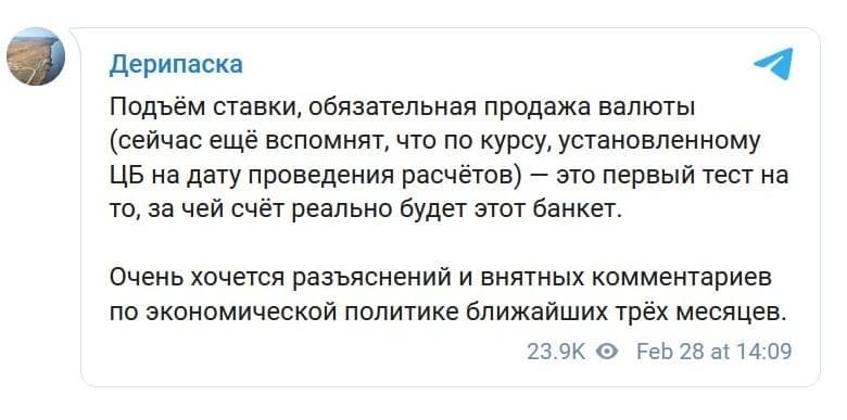 14:55 ⚡️Олег Дерипаска прокомментировал последние действия ЦБ.