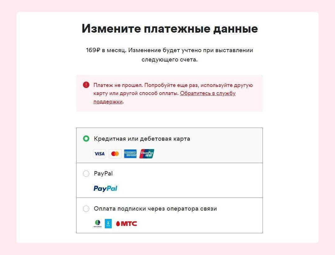 Пользователи из России не могут продлить подписку Spotify и Netflix, при оплате с карт «Сбера», «Тинькофф» и «Альфа-банка» появляется ошибка