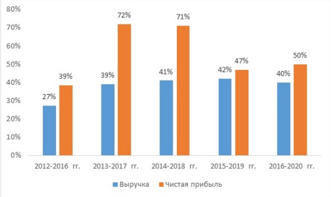Оценка уровня долговой нагрузки у быстрорастущих компаний показывает, что достижение высоких темпов, как правило, обеспечивается за счет опоры на собственные ресурсы, а не на привлечение заемных средств. Отношение чистого долга к EBIT у компаний из нового списка составило в среднем 0,6 х в конце периода по сравнению с 0,9 х у компаний из прошлогоднего списка.