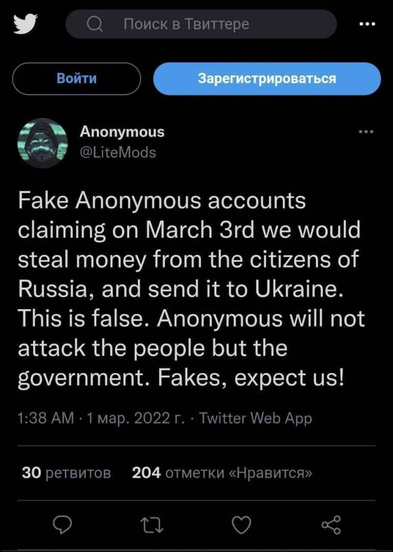 Фейк: Третьего марта 2022 года Anonymous взломают банковскую систему России и выведет все деньги со счетов граждан