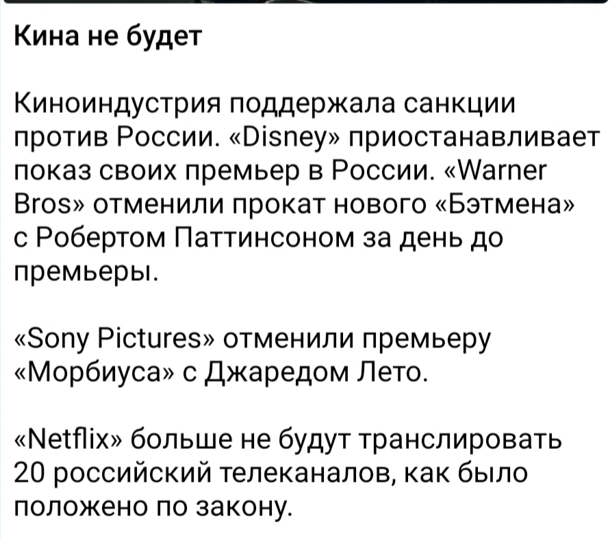 Кина не будет. Какие именно фильмы отменят из за санкций?