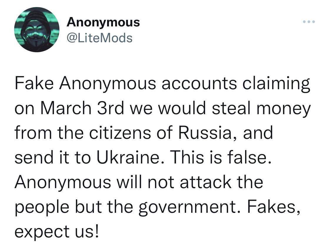 Недавно по интернету разошелся пост, в котором якобы хакерская группировка "Анонимус" огласила о том, что 3 марта все деньги жителей РФ будут отправлены на счета украинцев, но буквально в этот же день, на официальном аккаунте в Твиттере хакеры опровергли эту идею назвав её фейком и сказали, что они намерены атаковать правительство, а не обычных граждан