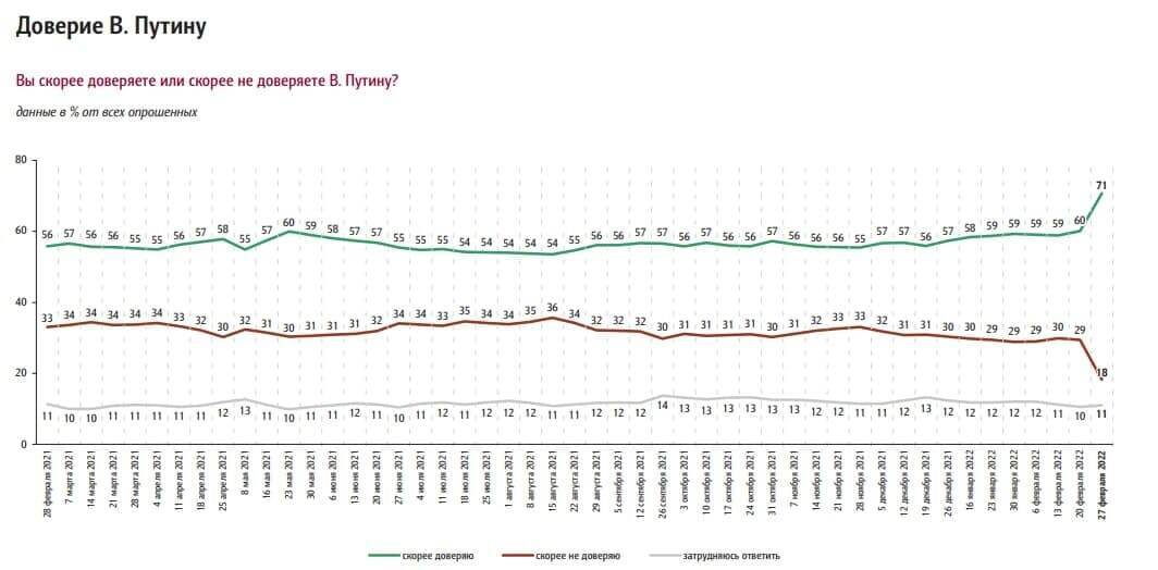 Уровень доверия россиян к Путину за неделю вырос с 60% до 71%, следует из опроса фонда «Общественное мнение»
