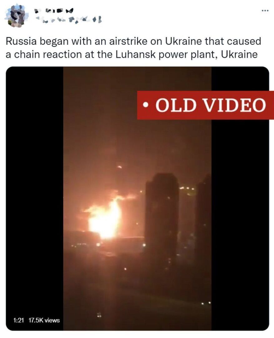 В этом ролике в Twitter демонстрируется якобы совершенный российской армией авиаудар по Украине, «вызвавший цепную реакцию на Луганской электростанции».