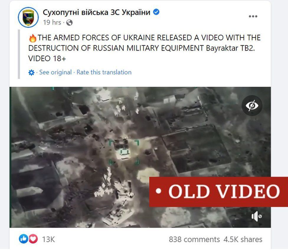В этом видео, размещенном на Facebook**** и в Twitter с неподтвержденного аккаунта, говорится о том, что на видео заснято уничтожение российского личного состава и техники на Украине, снятое через прицел беспилотника.