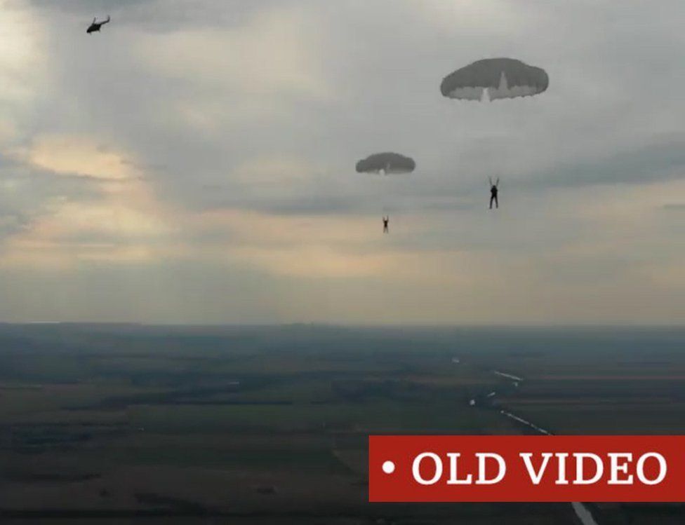В этом видео показаны мужчины в военной форме, которые кричат по-русски, прыгая с парашютом над сельскохполями.