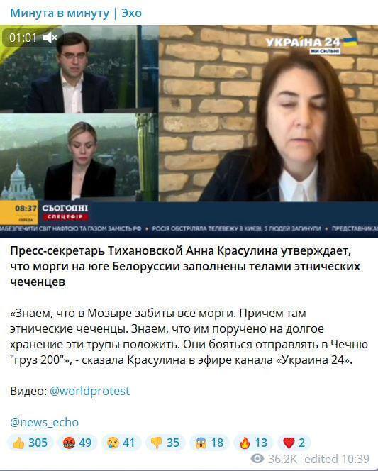 Фейк: В Белоруссии морги заполнены трупами этнических чеченцев, погибших в ходе операции в Украине. Об этом украинскому телеканалу «Рада» сообщила Анна Красулина, пресс-секретарь бывшего кандидата в президенты Белоруссии от оппозиции Светланы Тихановской.
