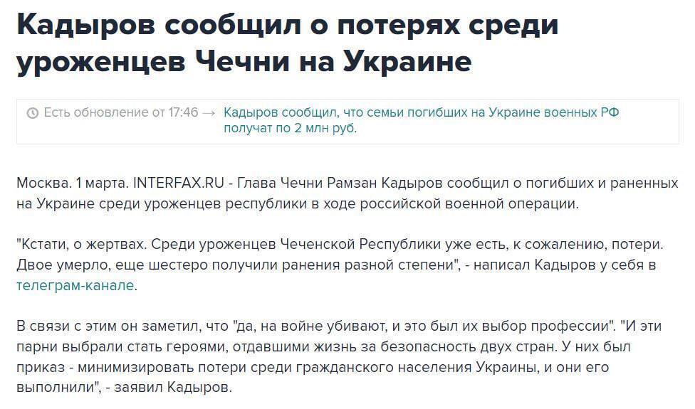 Правда: Ранее мы неоднократно опровергали необоснованную информацию украинской стороны о потерях среди российских военнослужащих. Глава Чечни Рамзан Кадыров сообщал в своем телеграм-канале, что двое чеченцев – участников военных действий – погибли, шестеро ранены. Но эти цифры в десятки, если не сотни раз меньше, чем те, которые приводятся в заявлениях украинской стороны. Добавим, что информация о погибших чеченских солдатах пока что распространяется только среди оппозиционных и украинских СМИ и медиаресурсов, что требует дополнительной проверки. Кроме слов, Анна Красулина не добавила доказательств к предоставленной информации. В сети уже распространялась информация о гибели одного из чеченских командиров, которую позже опровергли целый ряд новостных каналов.