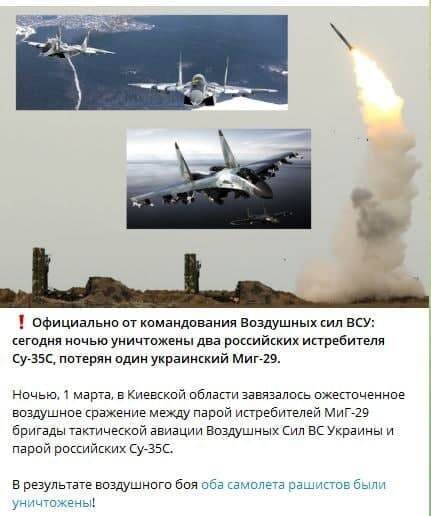 Фейк: Украинский телеграм-канал пишет, что ночью в ходе воздушного боя были сбиты два российских истребителя Су-35С и один украинский Миг-29.