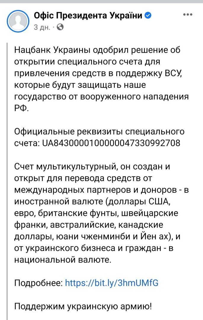 Последний раз уже сообщалось о 25 тысячах единиц огнестрельного оружия, розданных населению, не считая гранатомётов и боеприпасов. С началом войсковой операции России по демилитаризации и денацификации объявлено о всеобщей мобилизации, которая должна завершиться в течение 90 дней (?). Хотя на странице в Facebook**** главнокомандующего ВСУ Валерия Залужного ещё 23 февраля был помещён пост с благодарностью резервистам территориальной обороны. Украинское министерство обороны объявило приглашение в ВСУ бойцов со всего мира. А на странице президентского офиса выложен номер счёта на сбор средств для украинских вооружённых сил тоже со всего мира и с украинцев заодно. Принято решение освобождать тех преступников из бывших военнослужащих, которые согласятся воевать против российских войск. Служба безопасности Украины (СБУ) на свой официальной странице в Facebook**** поясняет как простым украинцам передавать сведения о российских военных на специально созданный канал в telegram. Интересная, конечно, тема — сбор разведданных через свидомых пользователей соцсетей и мессенджеров.
