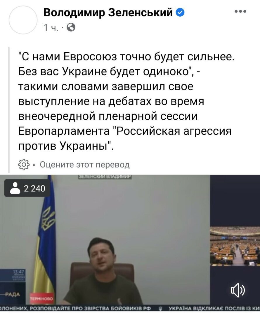 Зеленский В. А. "выпрашивает" для Украины место в Евросоюзе. Скриншот страницы "Офис президента Украины" в соцсети Facebook****