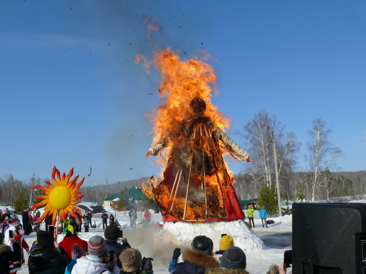 Природные явления получили своё воплощение в форме антропоморфного существа — большого соломенного чучела, облачённого в женское тряпьё, иногда со сковородкой или с блином в руках. Всю неделю чучело стояло на видном месте, либо же с ним развлекался народ, водя вокруг него хороводы, катая в конных упряжках или с ледяных горок. В конце праздника его сжигали, прыгая через костер. Пепел от костра по традиции люди разбрасывали по полям для того, чтобы земля была плодородной и давала богатые урожаи.