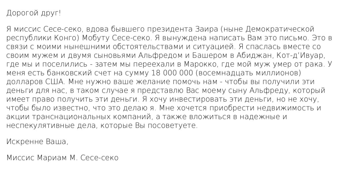 Так называется один из самых популярных видов мошенничества, который дошёл до нас именно с тех времен, когда Интернета ещё не было – тогда подобные письма рассылались массово по обычной почте (преимущественно в США). И сегодня нет-нет, да и всплывёт такое письмо в электронной почте, чаще всего в папке «Спам», за что надо сказать спасибо фильтру вашего почтового сервера.