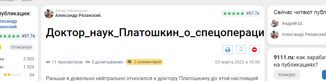 А для несведущих, есть предупреждение всем на этом сайте 9111: Внимание! По требованию Роскомнадзора в отношении специальной операции России на Украине запрещается употреблять выражения «война», «нападение», «вторжение», «оккупация». Статьи, содержащие такие выражения, будут удаляться, авторы блокироваться. По закону об уголовной ответственности за ложную информацию о ВС РФ запрещается публикация «фейковой» информации о специальной операции на Украине. Наказание – до 15 лет лишения свободы (статья 207.3 УК РФ «Публичное распространение заведомо ложной информации об использовании Вооруженных сил Российской Федерации»). А.Р. Надеюсь теперь вам понятно, что всякая ересь и фейки теперь здесь не пройдут?