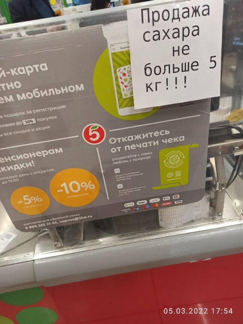 Теперь продажа сахара не больше чем 5 кг в руки!!!