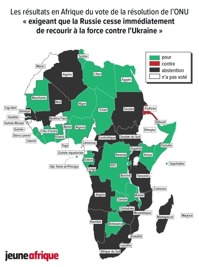 Напомним, 26 африканских стран не поддержали резолюцию, призывающую прекратить применение российской силы в Украине. В Африке, только Эритрея проголосовала против резолюции и выразила явную поддержку Кремлю. Однако, 16 других африканских стран воздержались, а девять не приняли участия в голосовании.