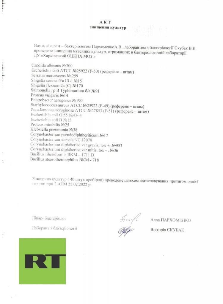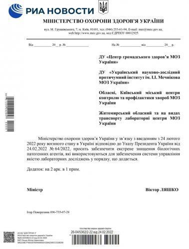 - "Нами получена от сотрудников украинских биолабораторий документация об экстренном уничтожении 24 февраля особо опасных патогенов возбудителей чумы, сибирской язвы, туляремии, холеры и других смертельных болезней".