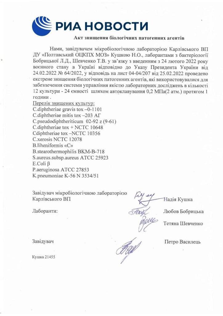 Бредовые доказательства. Во всех представленных лжецами из РИА Новости документах идет речь о стандартных музейных культурах, которые имеются в любой баклаборатории. В том числе и в России.