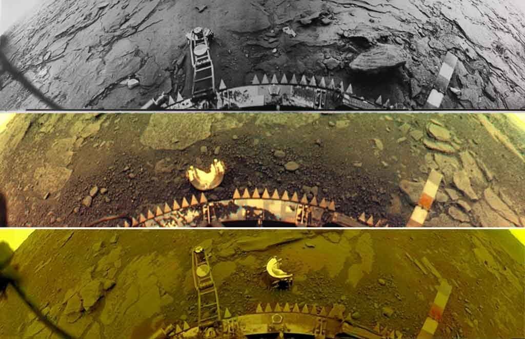 Цветная фотография поверхности Венеры переданная «Венерой-13». Прибор для измерения механических свойств грунта (в виде лесенки), эталонная шкала цветов. На панораме «Венера-13» заметно, как измельченный грунт слегка присыпал зубчатую оправу спускаемого аппарата