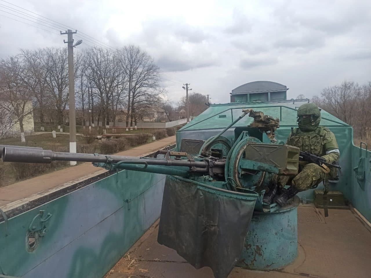 Российский боец на бронепоезде, задействованном в эвакуации иностранных граждан с Украины.