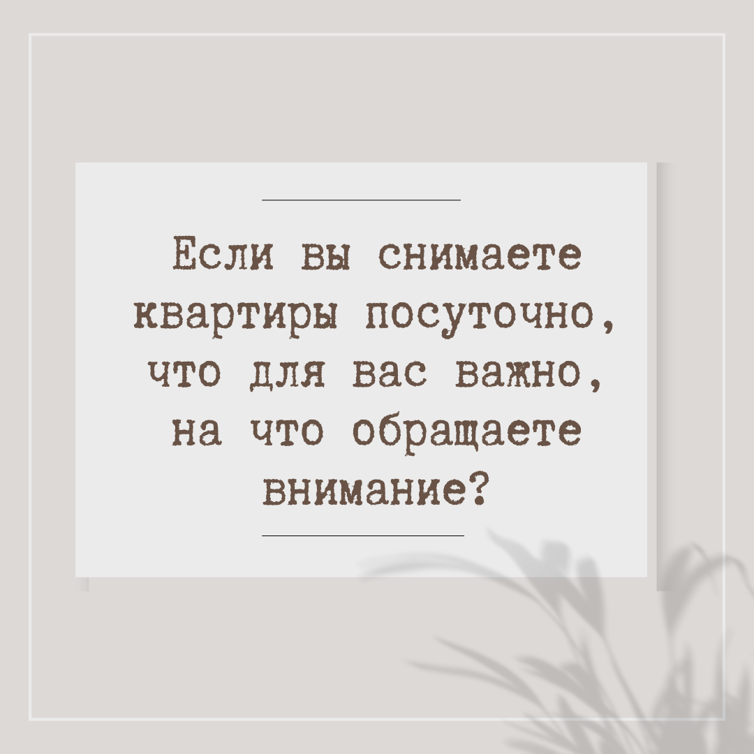 И, вот, у меня возник вопрос, если вы снимали или будете снимать квартиру посуточно на несколько дней, что для вас в приоритете, за исключением цены, на что в первую очередь обращаете внимание и что будет стоп-фактором?