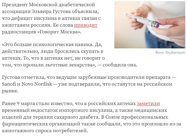 По данным «Коммерсанта», около 97% граждан, больных диабетом, используют импортные марки инсулина. Вернее, использовали – на полках уже не осталось инсулина из «недружественных государств», а потому в ход пошли перекупщики, превращающие отчаяние в бизнес. Российские биосимиляры инсулина, при этом, зачастую не удовлетворяют пациентов качеством.