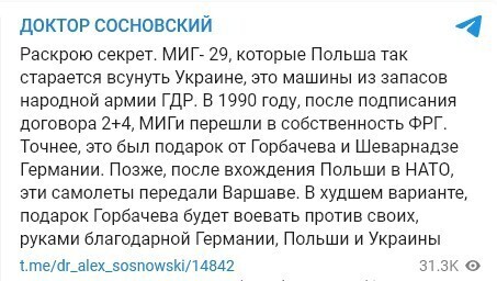 В ТГ-канале "Доктор Сосновский" он рассказал весьма необычную историю появления в Польше советских самолётов МиГ-29, тех самых, которые сейчас Варшава хочет "сплавить" Киеву.