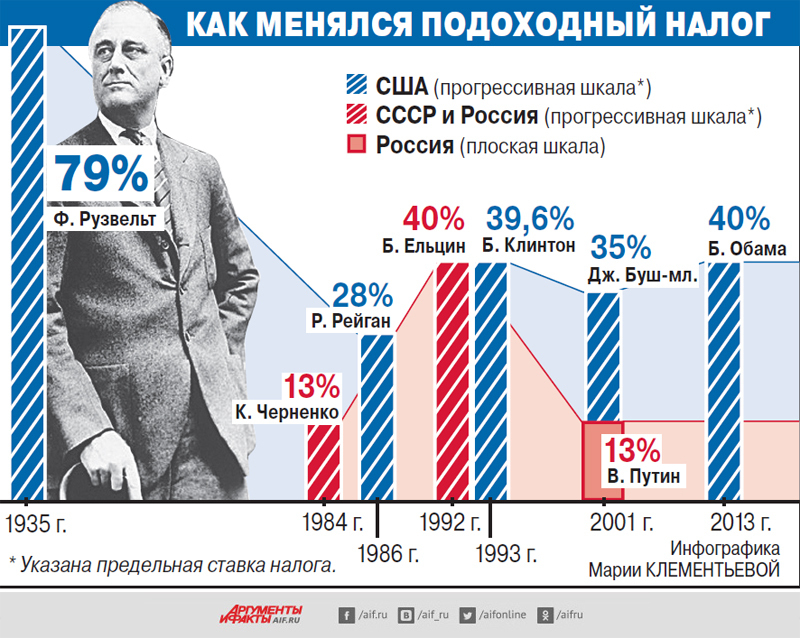 Президент США Рузвельт использовал прогрессивную шкалу для «вытаскивания экономики США» из мировой депрессии начала тридцатых годов прошлого века. В 20-е годы в США максимальная ставка налога на доходы была 24%. Было большое расслоение населения по доходам, 0,1% населения страны обладал 20% богатства. Внизу элемент графики для современного состояния расслоения людей в разных странах по уровню богатства.