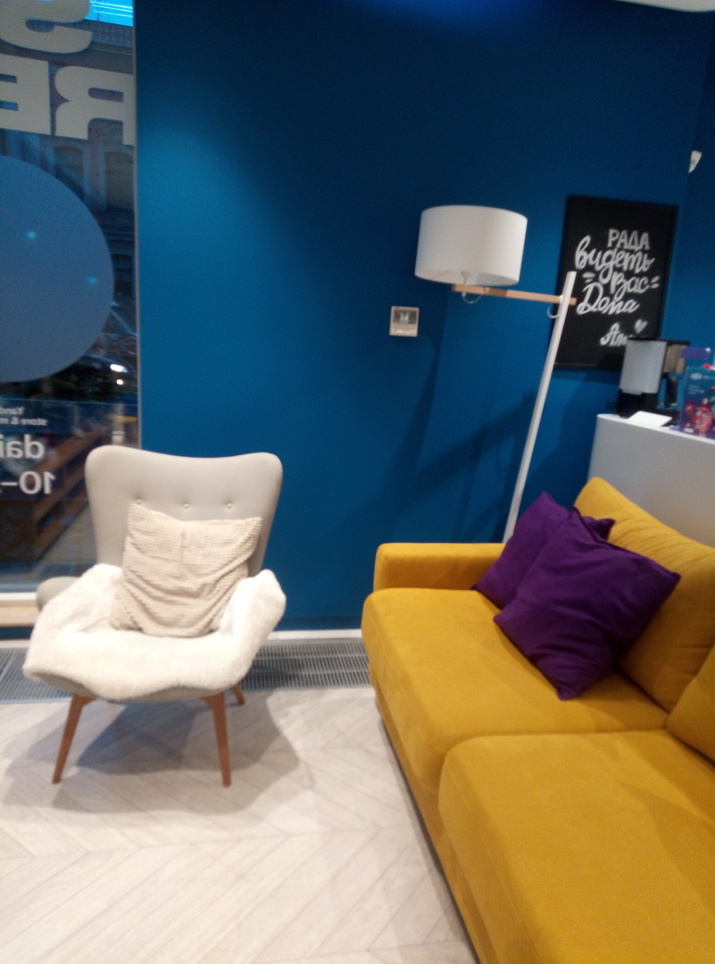 Интерьер оформлен в приятные для глаз сочетания синего и желтого цветов, в оформлении использованы товары марки Икеа и других известных брендов.