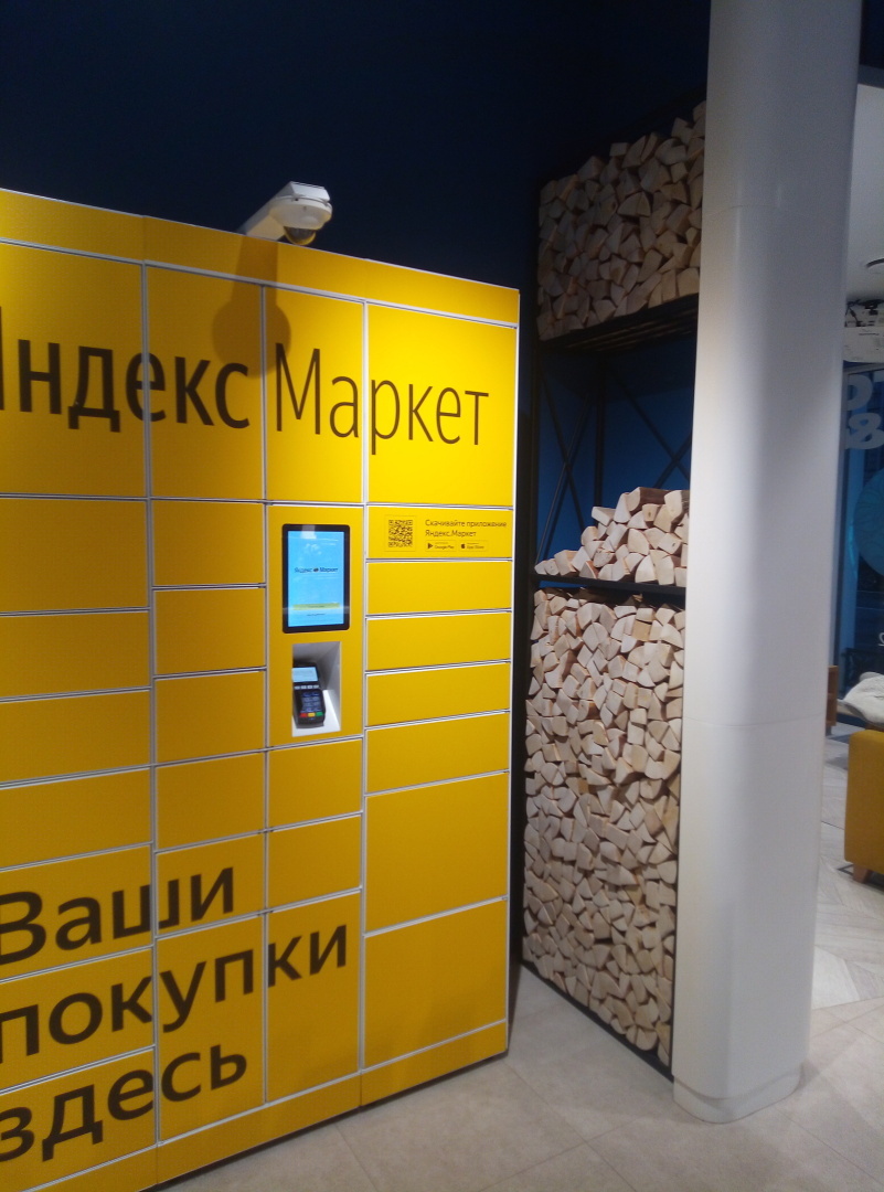Брендовая одежда Яндекса выделяется в центре зала и зрительно притягивает взгляды покупателей яркой расцветкой.