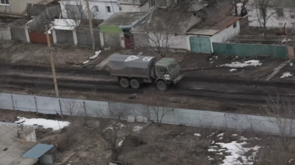 Z в рамке и дополнительные тактические обозначения в виде треугольника на грузовых автомобилях ВС РФ на Украине, снято с вертолёта сопровождения