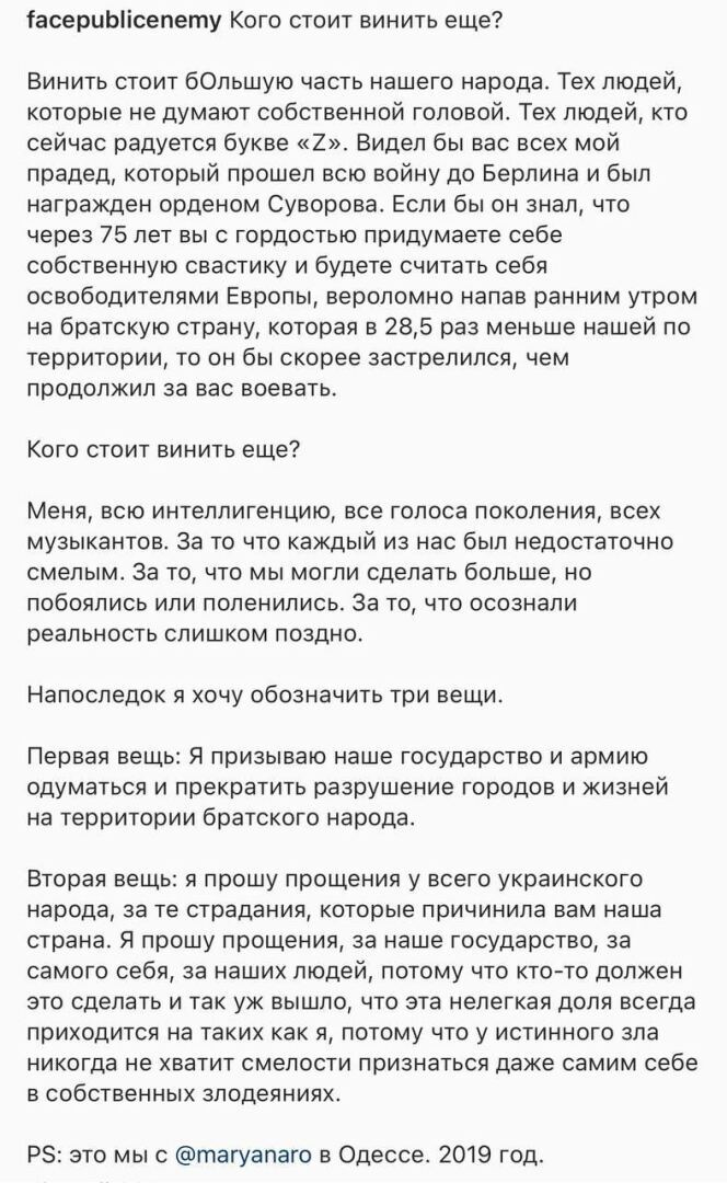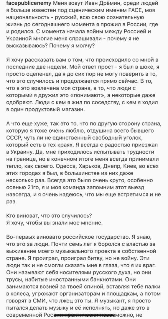 Face высказался в своём Instagram**** о ситуации вна Украине