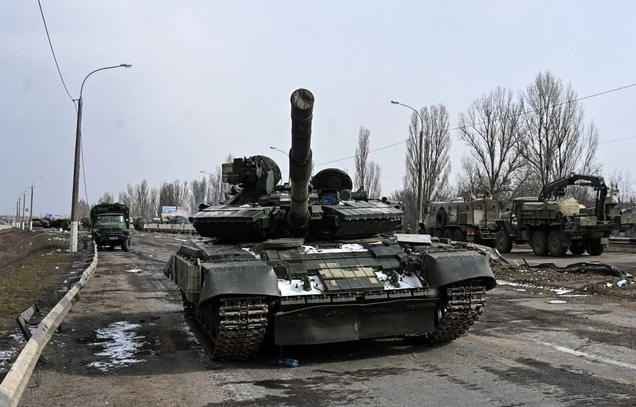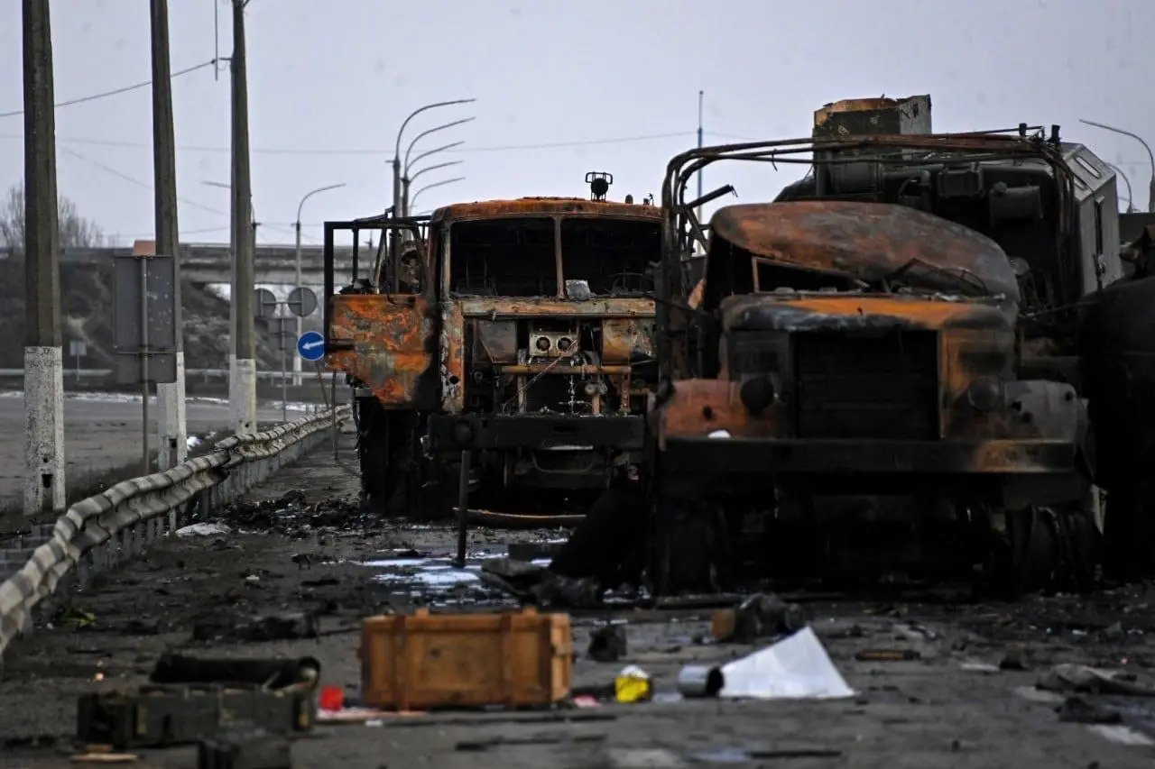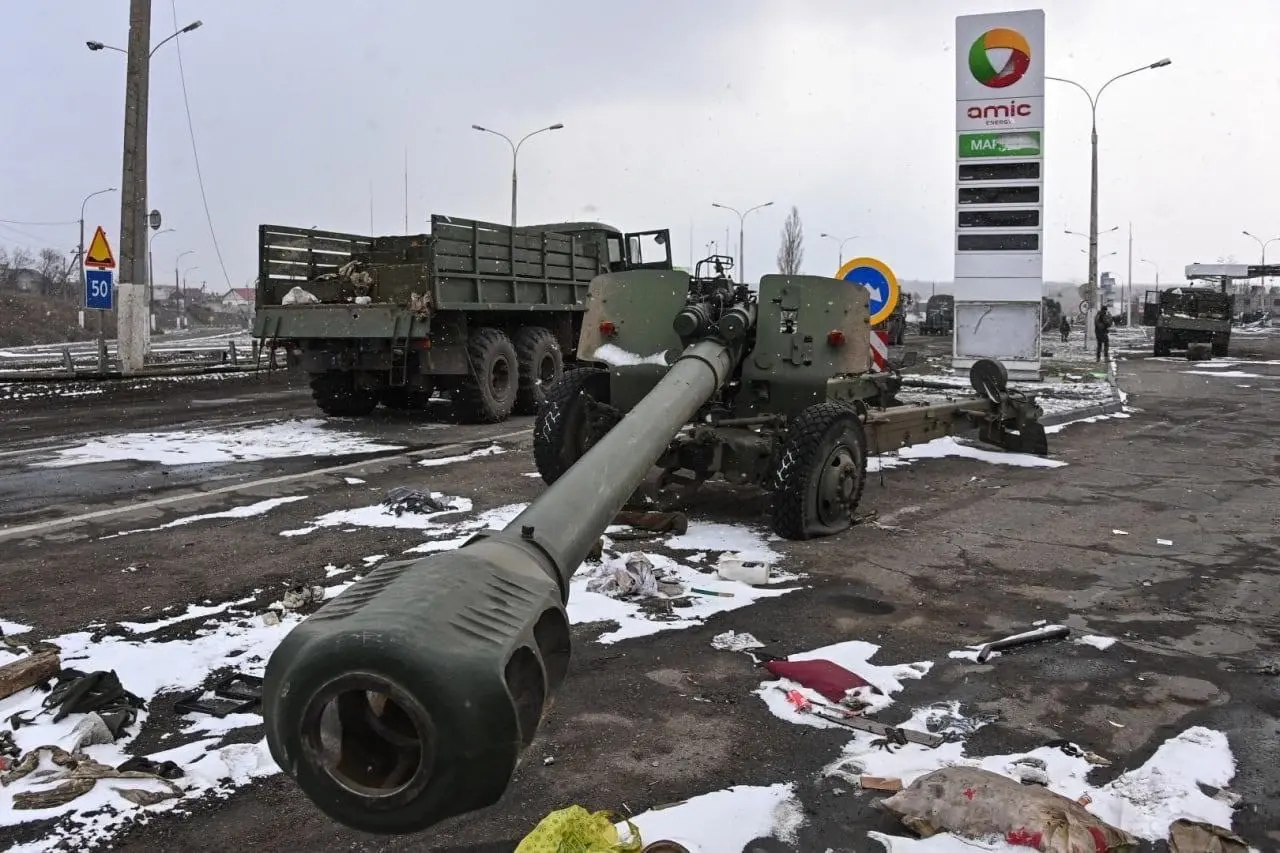 На кадрах можно увидеть брошенный танк и артиллерийские орудия, сгоревшие и посеченные грузовики.