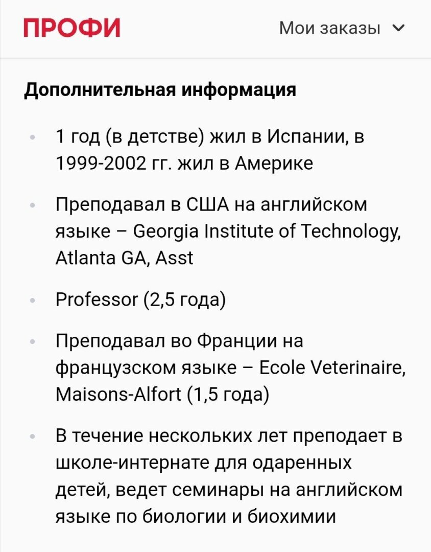 Но самое интересное в анкете — это пункт "Дополнительная информация". Что же, у этого "микробиолога из МГУ", а точнее репетитора по биологии и химии, основная масса клиентов которого — ученики средней школы, готовящиеся сдавать ЕГЭ, великолепный американский след в биографии. Кстати, в МГУ этот человек не работает, сомневающиеся могут проверить на сайте университета.