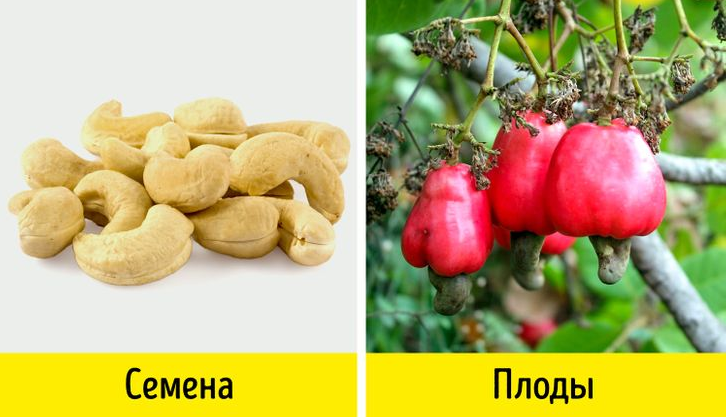 То, что мы привыкли считать орехом, увы, также семена одноименного растения. Яблоки кешью сладкие и ароматные - они на картинке красного цвета. А вот то, что растёт под ними считается плодами, в которых и скрыты семена.